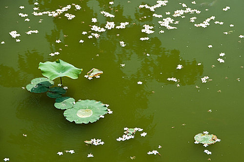 來這美麗的所在,還是要看些詩情畫意才好。看那碧水畫布,落花點綴。
