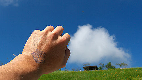 看,這畫面多閃、多美麗,還好有墨鏡。再把那朵雲PS成愛心就完美了,可惜我還沒學會……