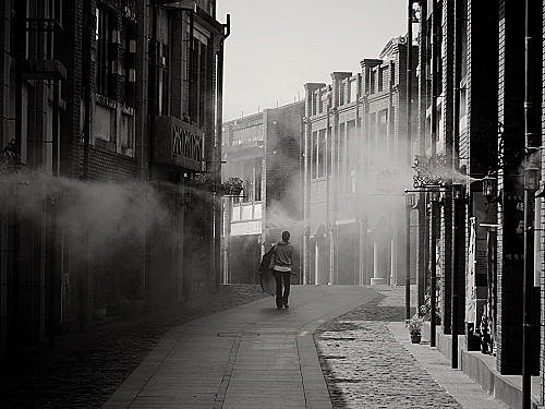 傳統藝術中心裡的街道,正在灑水降溫,閃過了一幅美麗街景。